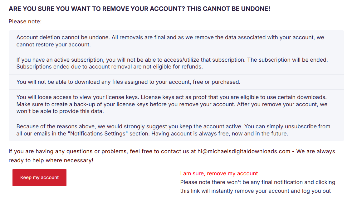 If you remove your account, you will lose access to your downloads license keys and you will not be able to re-download any of the products you accessed through your account. As a result, it may be difficult for you to prove that you have the right to use your downloads if asked.
